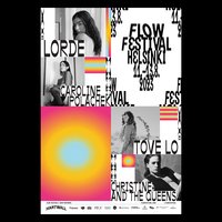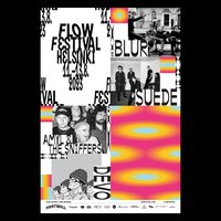 Visual identity for the 2023 edition of Flow Festival Helsinki. The elements started to narrow and stretch and the identity system was developed further. The use of white space became a central element.